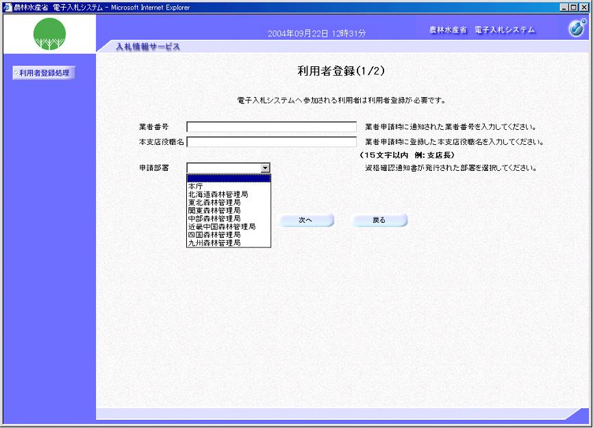 利用者登録(1/2)画面の「申請部署」について、「資格確認通知書が発行された部署を選択してください。」と 注釈が記載されておりますが、支店等において利用者登録を行う場合は、支店等の該当局(利用者登録の審査を受けようとする局)を選択して申請していただくようお願いします。 (例)関東森林管理局で本社の資格確認通知書が発行されている場合でも、北海道支店で利用者登録を実施する場合は、 北海道森林管理局に利用者登録の申請を行う。 | |||||||